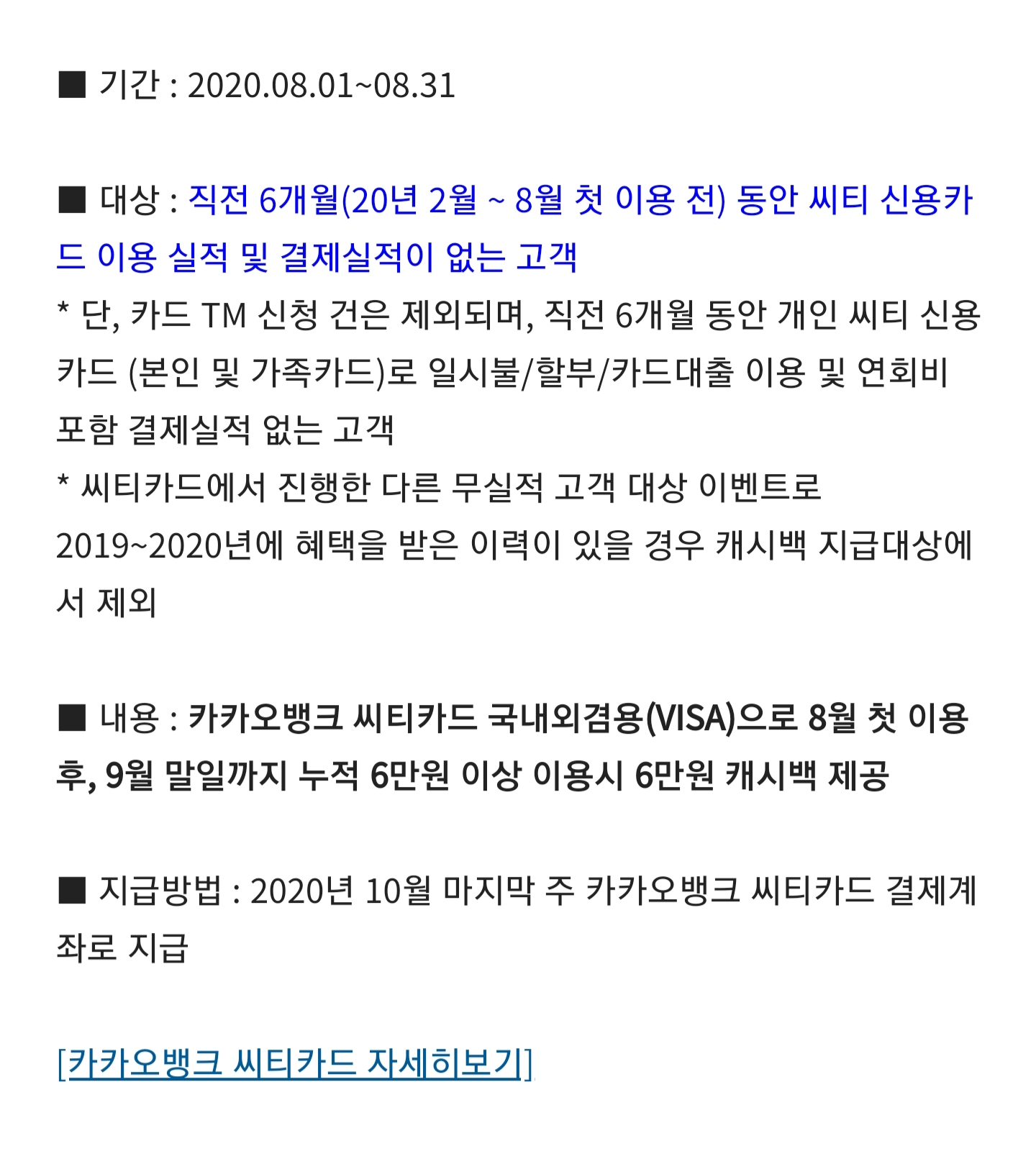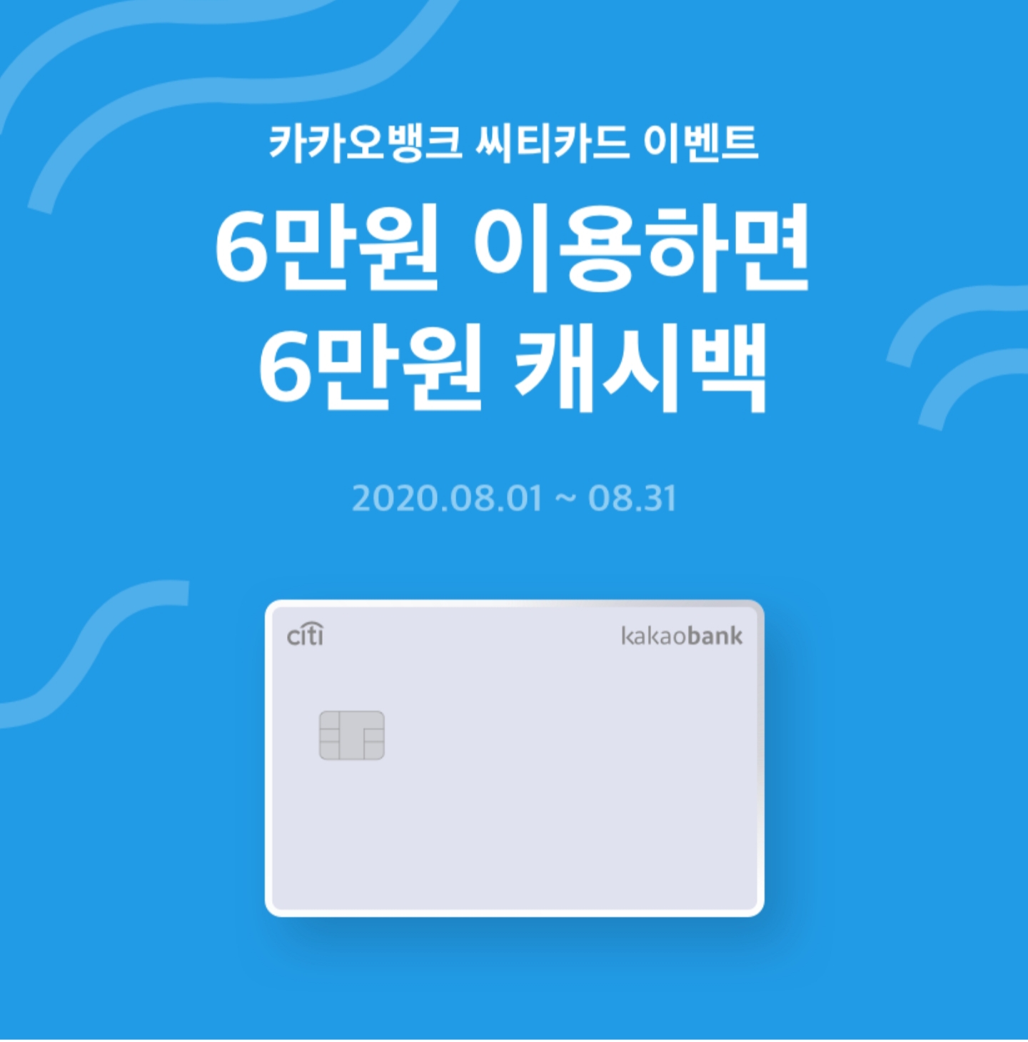 카카오뱅크 씨티카드 국내외겸용(VISA)(꼭체크!!) 8월 첫 이용 후 9월 말일까지 누적 6만원 이상 이용시 6만원 캐시백을 제공합니다.