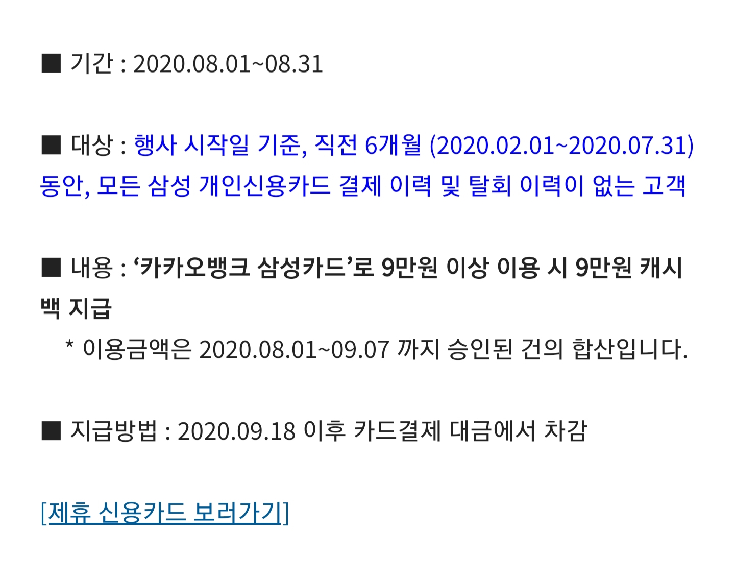 9만원이용하면 9만원을 캐시백 해주기 때문입니다. 이용금액은 2020.08.01~09.07 까지 승인된 건의 합산이라고 하고