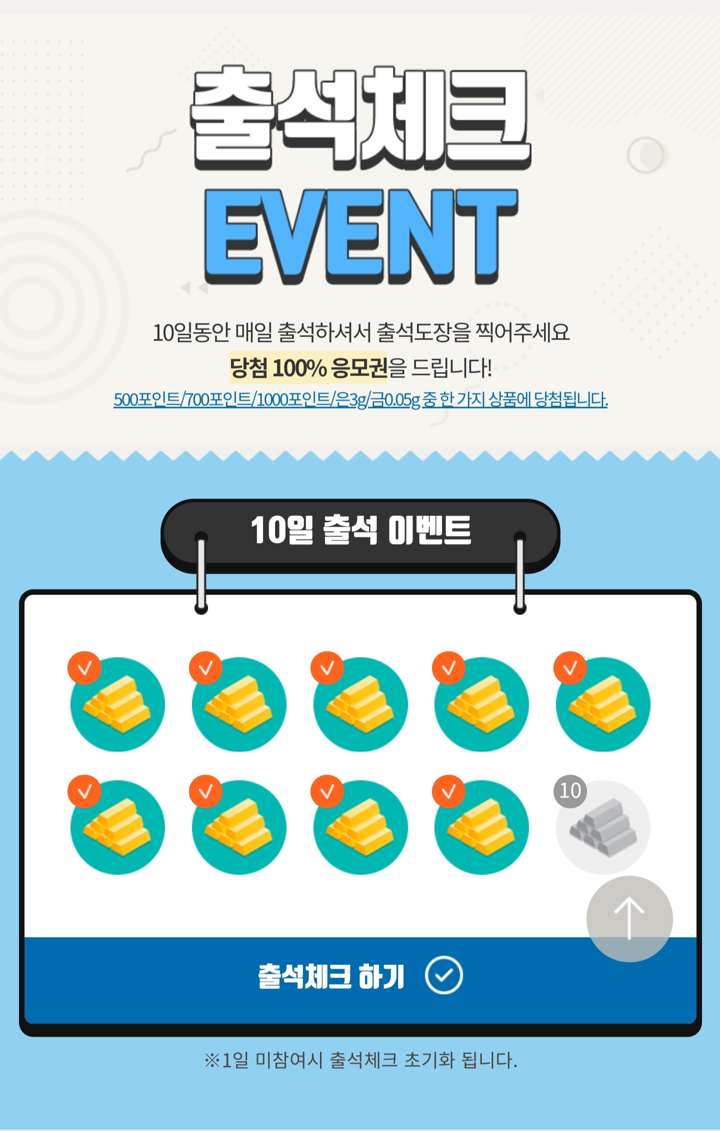 저는 20일동안 출석체크를 해서 2번 리워드를 받았습니다. 금, 은, 포인트 중에서 랜덤으로 당첨 되는 리워드가 많지는 않지만 꽤나 쏠쏠하게 받을 것 같습니다. 티끌 모아 태산이라는 자세로 조금씩 조금씩 모으다보면 많이 모이 겠죠.
