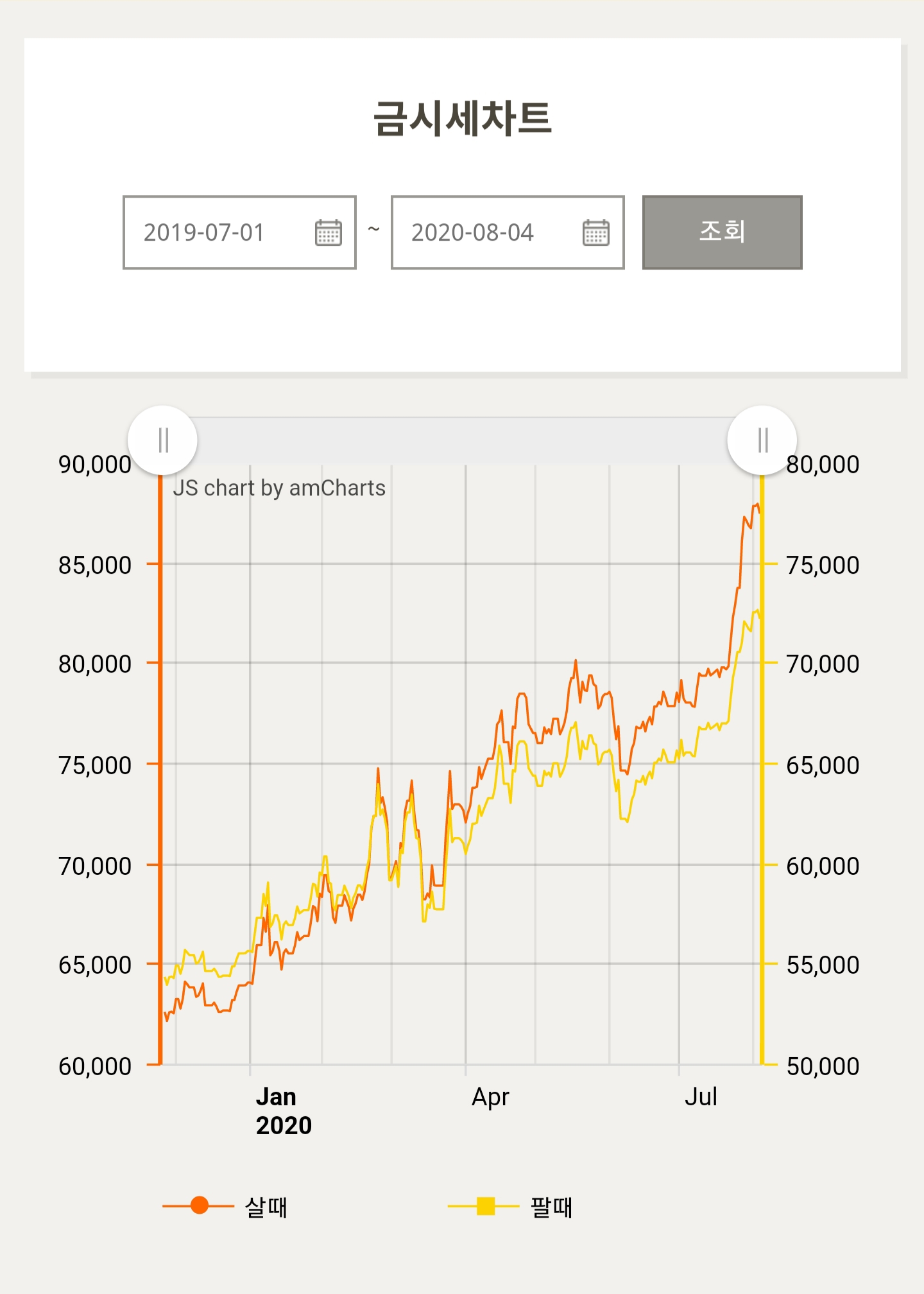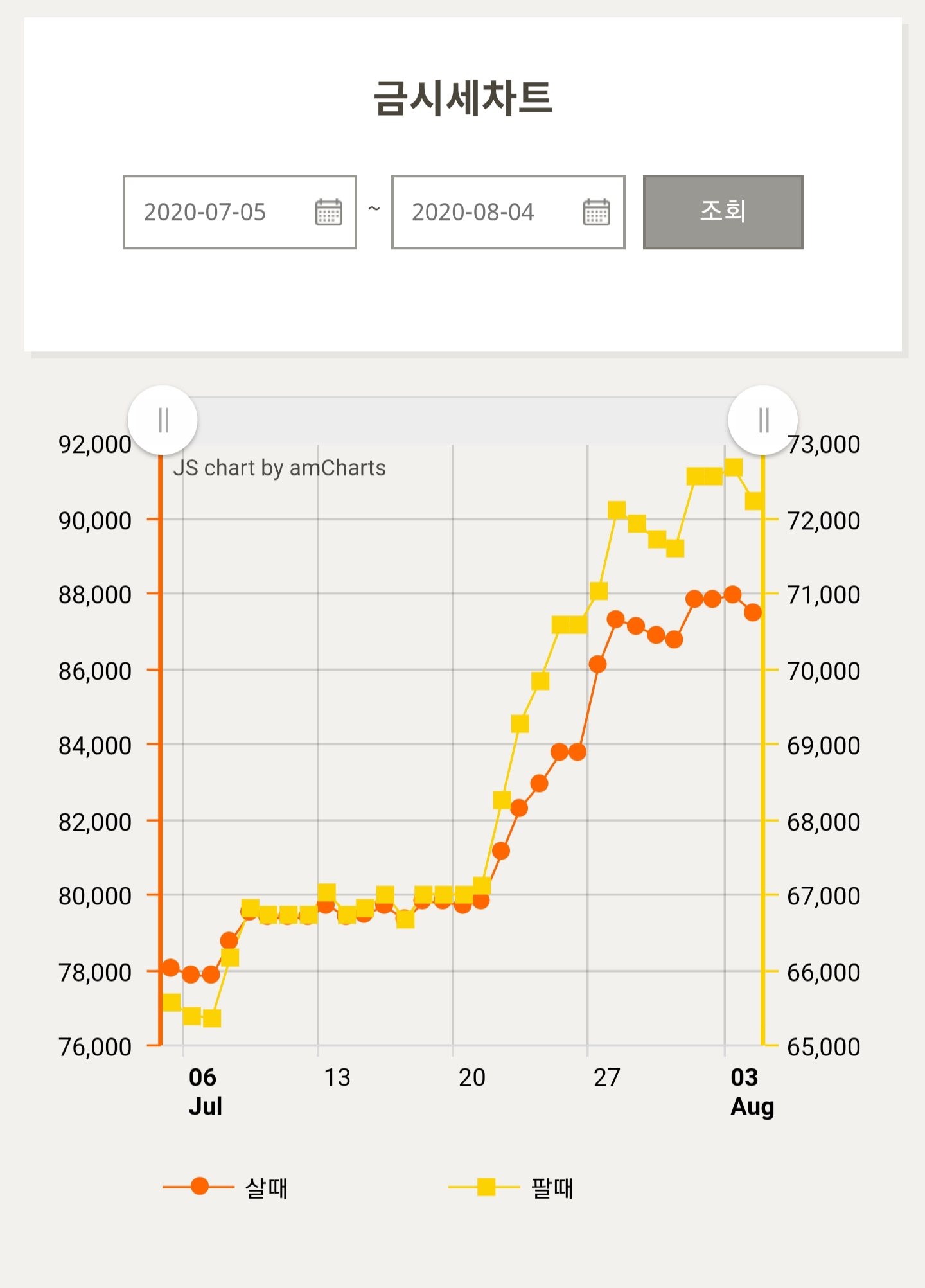 금시세 차트를 확인할 때 기간을 설정해서 조회를 누르면 차트를 보기에도 간편합니다. 금모아에서는 금시세 차트와 은시세차트를 제공합니다. 확실히 1년 그래프를 보면 변곡이 있기는 하지만 우상향으로 계속 가격이 성장 해왔다는 것을 볼 수 있습니다. 이 글을 쓰는 도중에도 금에 투자하고 싶다는 생각이 드는데요.