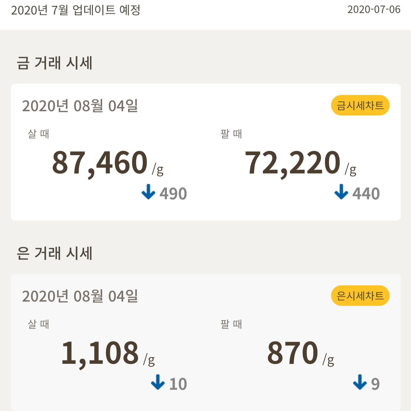 메인화면에 금 시세와 은 시세가 나와서 매일 매일 출석하면서 시세가 어떤지 확인이 가능하고 금시세 차트, 은시세 차트로 들어가서 확인도 가능합니다. 금도 천정부지로 가격이 올라가지만, 요즘은 은 시세도 만만치 않고 올라가고 있습니다. 주요 산업재로 쓰인다는 은도 차세대 투자수단으로 각광을 받고 있기 때문에 매일매일 출석하면서 확인하면 확실히 도움이 될 것 같습니다. 여러 증권앱에서 확인해본 결과 요즘에는 은선물 관련 ETF도 가격이 많이 상승하는 추세이기 때문에 은도 확실히 주목해야 겠습니다.