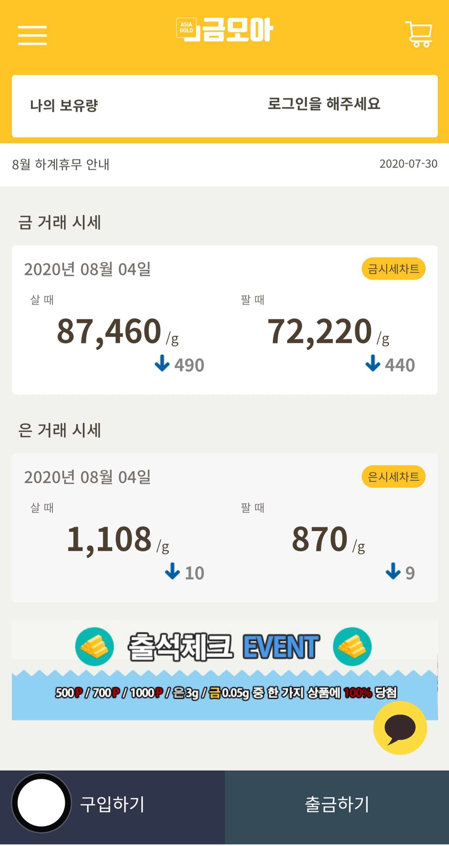 그래서 금모아 앱을 일단 설치를 해봤습니다. 친숙하지 않은 투자 수단인 금과 일단 친해지고 싶어서 입니다. 금모아 라는 앱에서는 매일 매일 출석을 유도하고 10일을 연속으로(1일 미참여시 출석체크 초기화 참고) 출석 체크하면 포인트, 은, 금 중 한가지 상품을 랜덤으로 줍니다. 저는 20일째 출석을 했지만, 두번다 포인트 500점에 당첨되었습니다. 그렇게 따지면 1일 당 50점을 받는 정도로 생각하면 될 것 같습니다. 만약에 금 0.05g을 받는다면 하루에 얼마는 버는 것일까 환산해보면 8월 4일자 금 1g의 가격은 87460원이고 0.05g의 가격은 4373원이 됩니다. 그걸 10일로 나누면 1일에 437원을 받는것 과 같게 됩니다.