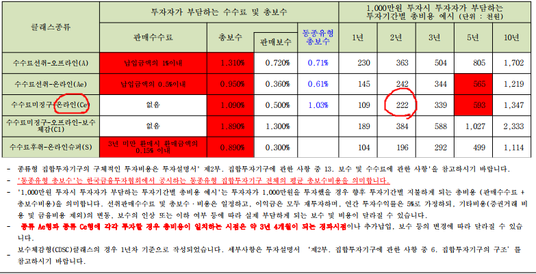 펀드를 상세하게 보다보면 어디든 펀드 투자 설명서가 첨부되어있습니다. 펀드 투자 설명서에는 위와 같이 투자자가 부담하는 수수료및 총보수를 포함하게 되어있습니다. 저는 수수료를 미징구하는 온라인 상품으로 Ce 클래스 펀드 상품을 선택했습니다. 제가 만약 해당펀드에 2년간 1000만원을 투자하면 제가 부담하는 총비용은 22만 2천원을 부담하게 되는 것입니다. 생각보다 꽤 많은 비용을 부담하는 구나 라고 알게되었고, 여기서 저는 펀드를 구매하는 것이 꽤나 수수료와 보수를 많이 부담하는 것이구나를 깨닫게 되었습니다. 그래서 수수료나 보수를 저렴하게 부담하고 펀드를 구매할 수 있는 곳은 없을까 궁금했고, 한국포스증권(구.펀드 슈퍼마켓)을 알게되었습니다. (=> 추후 포스팅 예정)