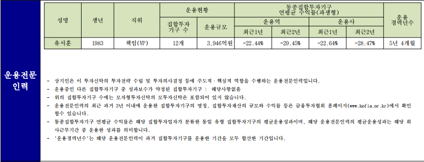 또한 펀드 투자 설명서에는 운용전문인력이 어떤 사람인지도 정리가 되어있습니다. 제가 구매한 펀드의 운용전문인력은 유서훈책임 이라는 분이 운용하였습니다. 최근 1년(-22.44%), 최근 2년(-29.45%) 운용 수익률이 생각보다 너무 안좋으셔서 좋은 상품이 아닌가 의심도 하게 되었습니다. 운용 경력년수가 5년 4개월로 경력도 짧지 않으십니다. 또한 운용전문인력의 최근 과거 3년 이내에 운용한 집합투자기구의 명칭 집합투자재산의 규모와 수익률 등은 금융투자협회 홈페이지(kofia.or.kr)에서 확인 또한 가능하다고 합니다.