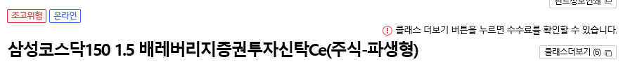 제가 처음으로 선택한 펀드는 [삼성코스닥150 1.5배레버리지증권투자신탁Ce(주식-파생형)] 입니다. 단 5만원만 넣어봤습니다. 단지 넣어봤습니다. 펀드라는 것을 이해하려면 일단 사보자! 라는 생각으로 고민할 것없이 부담없이 5만원정도 넣어보는것은 해볼 수 있는 것이니까. 일단 저는 삼성코스닥150 1.5배레버리지증권투자신탁Ce(주식-파생형) 라는 이름에서 볼수 있듯이 삼성증권에서 코스닥150을 인덱스로 1.5배의 레버리지로 (1.5배의 레버리지가 무슨 뜻인지는 더 공부해야겠습니다만..;;) 투자를 하는 것이구나 펀드의 클래스는 Ce니까 후취수수료를 붙이고(C) 인터넷 전용 (e) 상품이구나 하고 이해를 했습니다.