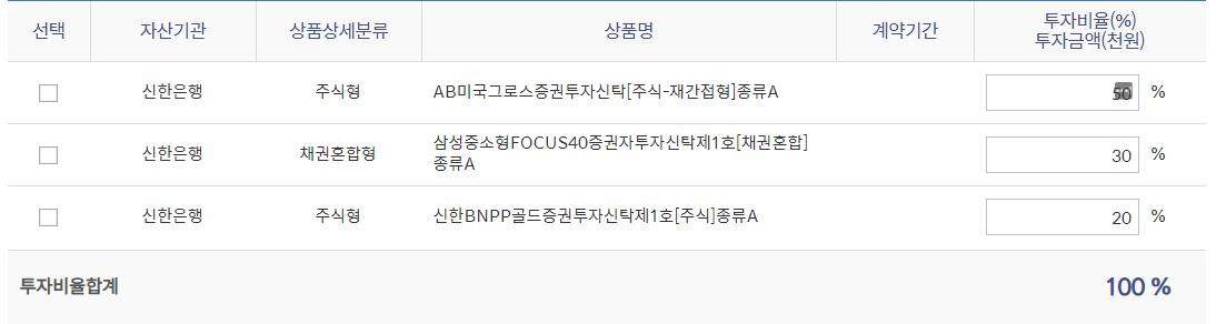 => 미국의 성장하는 회사(대형우량주)들에 주로 투자하는 해외 펀드로 얼라이언스번스틴이라는 회사에서 운용하는 신한은행 추천펀드를 50%로 설정했습니다. 다소 원금 손실 위험이 있는 (다소높은위험)펀드지만 미국 주식은 우상향하는 방향으로 성장을 계속 진행하기 때문에 운용을 해보면서 점진적으로 지켜봐보자 하고 선택한 상품입니다.