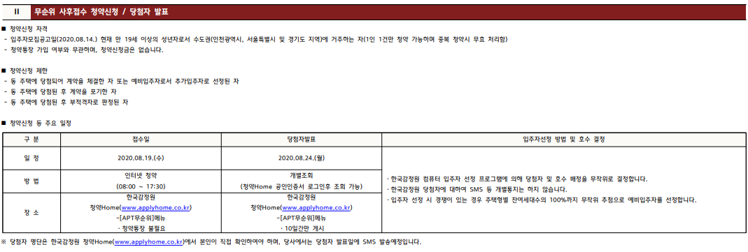 ■ 본 무순위 사후접수 입주자모집공고는 청약통장을 사용하지 않는 청약으로 청약 당첨(예비입주자 포함)시 한국감정원 등 당첨자로 명단 관리 되지 않으며 재당첨 제한 등 제한을 받지 않습니다. ==> 중요참고★