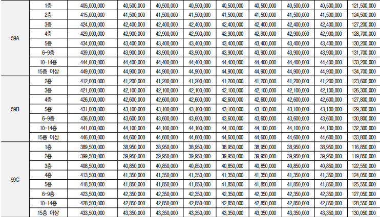 59 형인 경우에는 가격이 3억 8천~ 4억 4천9백까지 분포해있습니다.