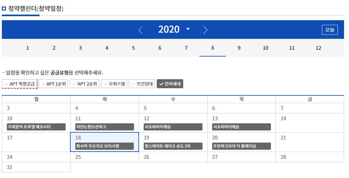 바로가기: https://www.applyhome.co.kr/ai/aib/selectSubscrptCalenderView.do#a 청약홈에서 청약캘린더를 보면 힐스테이트 레이크 송도 3차가 각각 2020년 8월 19일에 청약 일정이 있습니다. 청약홈 | 청약캘린..