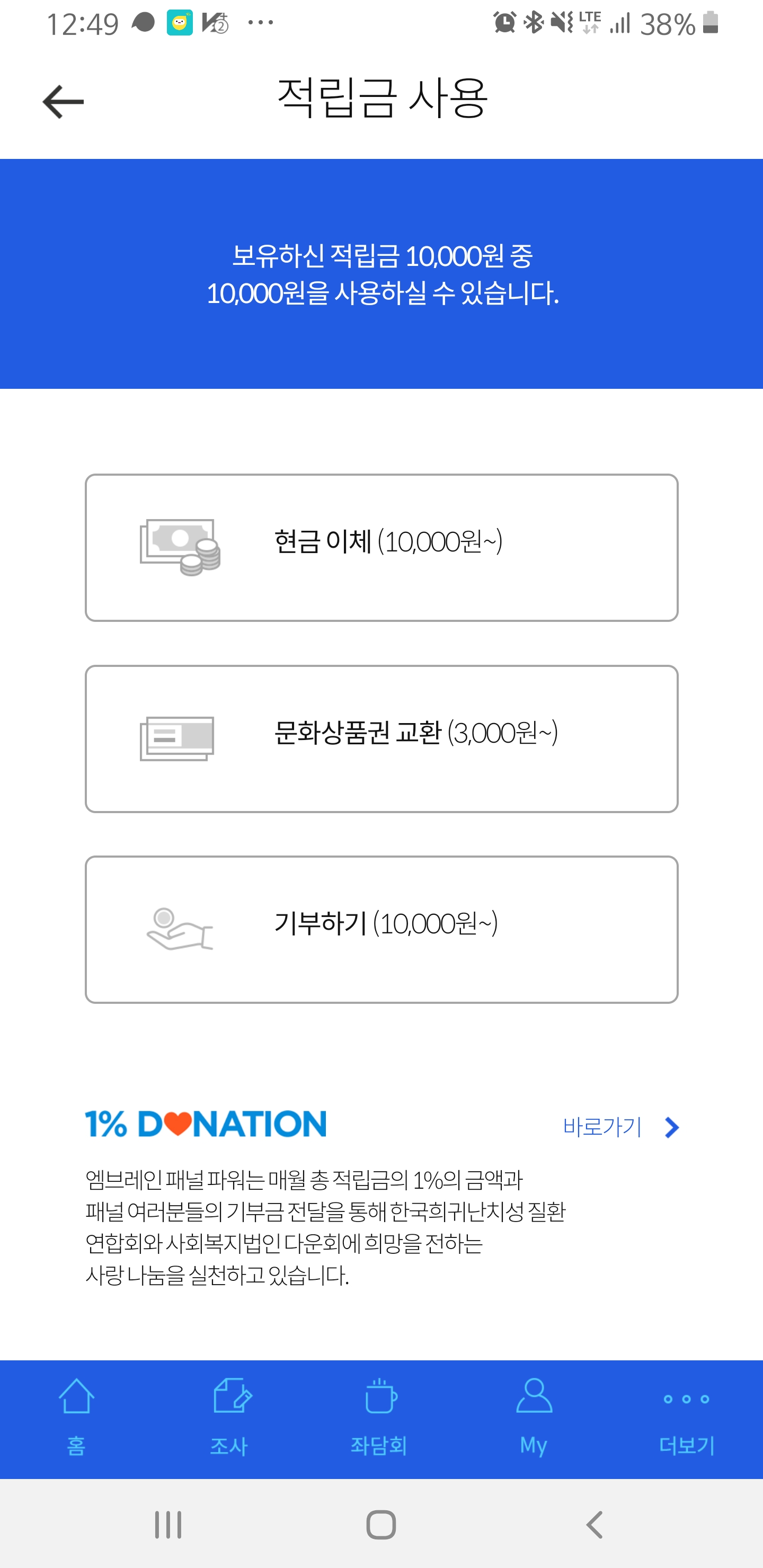 적립금이 1만원이 넘으면 현금이체, 기부하기가 가능하고