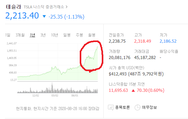 테슬라가 요즘 아주 핫합니다. 핫하다 못해서 뜨거워서 화상을 입을 지경입니다. 8월 28일 기준으로 주식가격이 2000슬라를 넘어서 2213달러가 되었습니다. 최근의 테슬라는 상단 이미지 차트의 빨간색 동그라미에서 볼 수 있듯이 아주 가파른 기울기를 뽐내면서 가격이 상승하고 있습니다. 요즘 유튜브나 커뮤니티에서의 화제는 도대체 저 테슬라가 언제까지 올라갈지 이제는 떨어질때가 된거 아닌지 하는 그 마켓 타이밍입니다. 내가 지금이라도 테슬라에 올라타서 수익을 볼 것인지 아니면 떨어질때를 기다리면서 매수 타이밍을 엿볼것인지 말입니다.