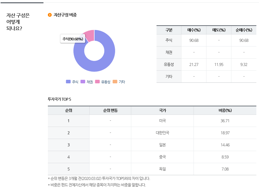 자산구성은 주식이 약 90프로 유동성(현금, 선물등)이 약 10%정도로 구성되어있습니다. 그리고 국가별 투자 비중은 미국이 36%이고 대한민국이 18%그리고 기타 국가들로 구성되어있네요.