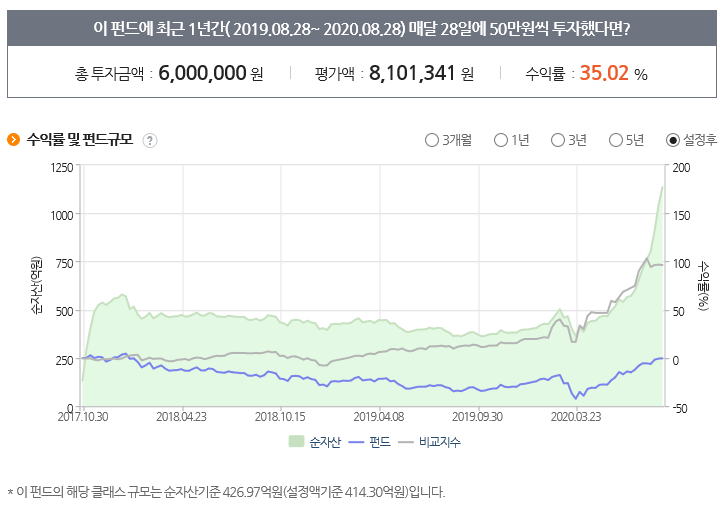 저는 이 펀드에 적립식 투자로 매달 납입을 할 예정입니다. 앞으로의 상태도 블로그에 올릴테니 지켜봐주세요. 오늘은 이만 끝.