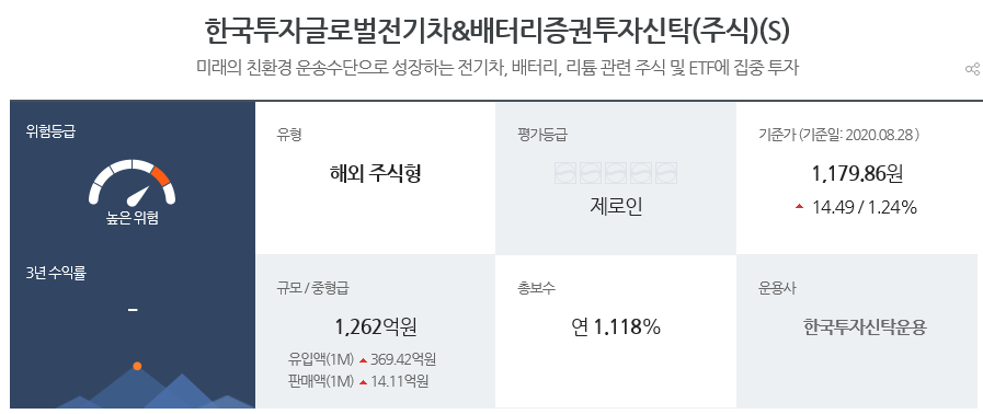 앞의 설명에서 볼 수 있듯이 미래의 친환경 운송수단인 전기차, 배터리, 리튬 관련 주식, ETF에 집중투자를 해주는 펀드입니다. 상품명에서도 알 수 있듯이 한국투자신탁운용에서운용하는 세계적인 전기차에 투자를 하는 증권투자신탁이다. S클래스이기 때문에 다른 A나,C클래스보다 보수, 수수료가 상대적으로 저렴하다는 의미를 내포하고 있다는 것도 알 수 있습니다.