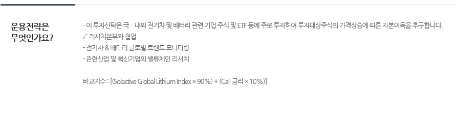 기본적인 운용전략이 전기차 & 배터리 글로벌 트렌드를 모니터링하고, 관련산업 및 혁신기업의 밸류체인 리서치입니다. 짧게 말하면 요즘 핫한 테슬라를 비롯한 전기차 관련 주식들로 운용을 하겠다 이 뜻이죠.