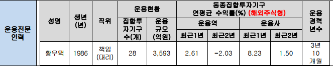 내 펀드를 운용해주는 운용전문인력은 황우택 책임님입니다. 최근 1년간 연평균 수익률이 2.61이고 최근 2년간 수익률은 -인데요. 일단 펀드의 내용자체가 괜찮으니까 한번 믿고 맡겨보겠습니다.