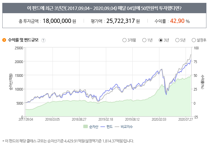 3년간의 수익률 그래프를 보면 코로나때 많이 빠진 것을 포함해 전체적으로 아름다운 우상향 그래프를 보여주고 있습니다. 해당클래스 규모는 순자산 기준 4429억원입니다. 총 규모는 1조 4948억원으로 초대형급 규모를 자랑하고 있습니다. 요새 월급쟁이 재테크 연구 네이버카페라든지 커뮤니티에서도 이 펀드에 가입했다는 사람이 많은데요. 그만큼 인기가 좋은 펀드인 것 같습니다.