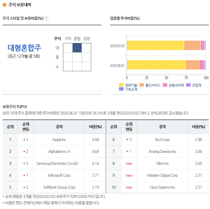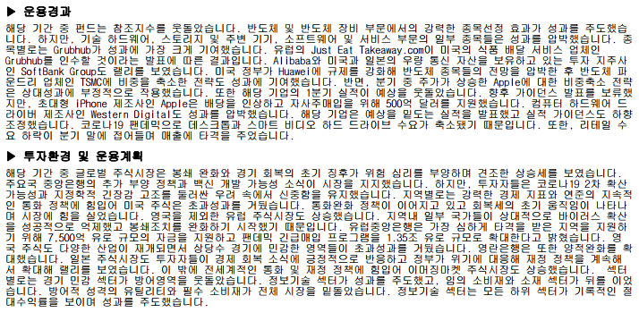 운용보고서를 확인해보면 어떤식으로 운용하고 있고 수익률에 어떤 기업이 기여를 많이 했는지도 볼 수 있습니다. 분기중에 주가가 상승한 애플을 비중축소시켰다가 상대성과에 부정적으로 적용했다는 내용도 참고할만하고, 코로나19 펜데믹으로 데스크탑과 스마트 비디오 하드 드라이브 수요가 축소되어서 제조업체들의 수익이 부진했다는 것도 알 수 있습니다.