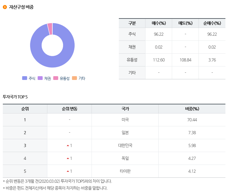 자산구성 비중은 주식이 96%이고 채권이 0.02% 주식형 펀드인것을 알 수 있습니다.
