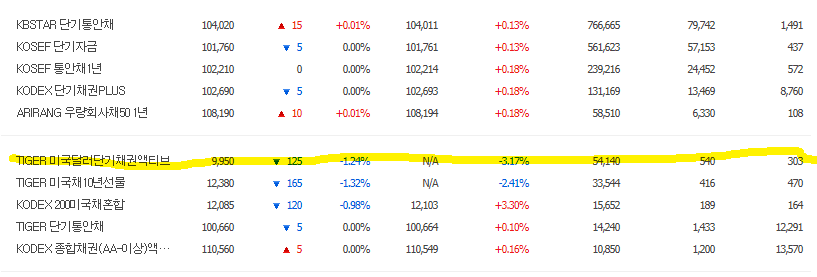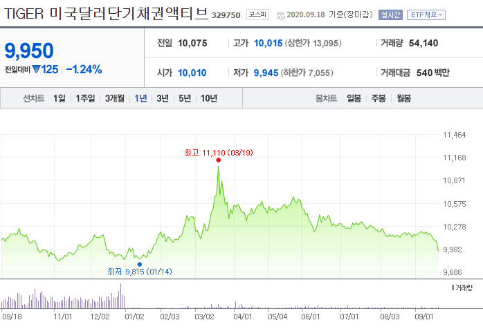 근 1년간 해당 ETF TIGER 미국달러 단기채권액티브는 가격이 가장 높았다 . (3월 19일)