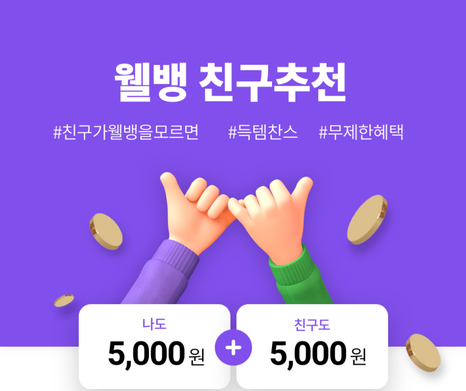 웰뱅친구추천을 해서 가입을 하면 추천인과 피추천인이 각자 5천원을 받는다