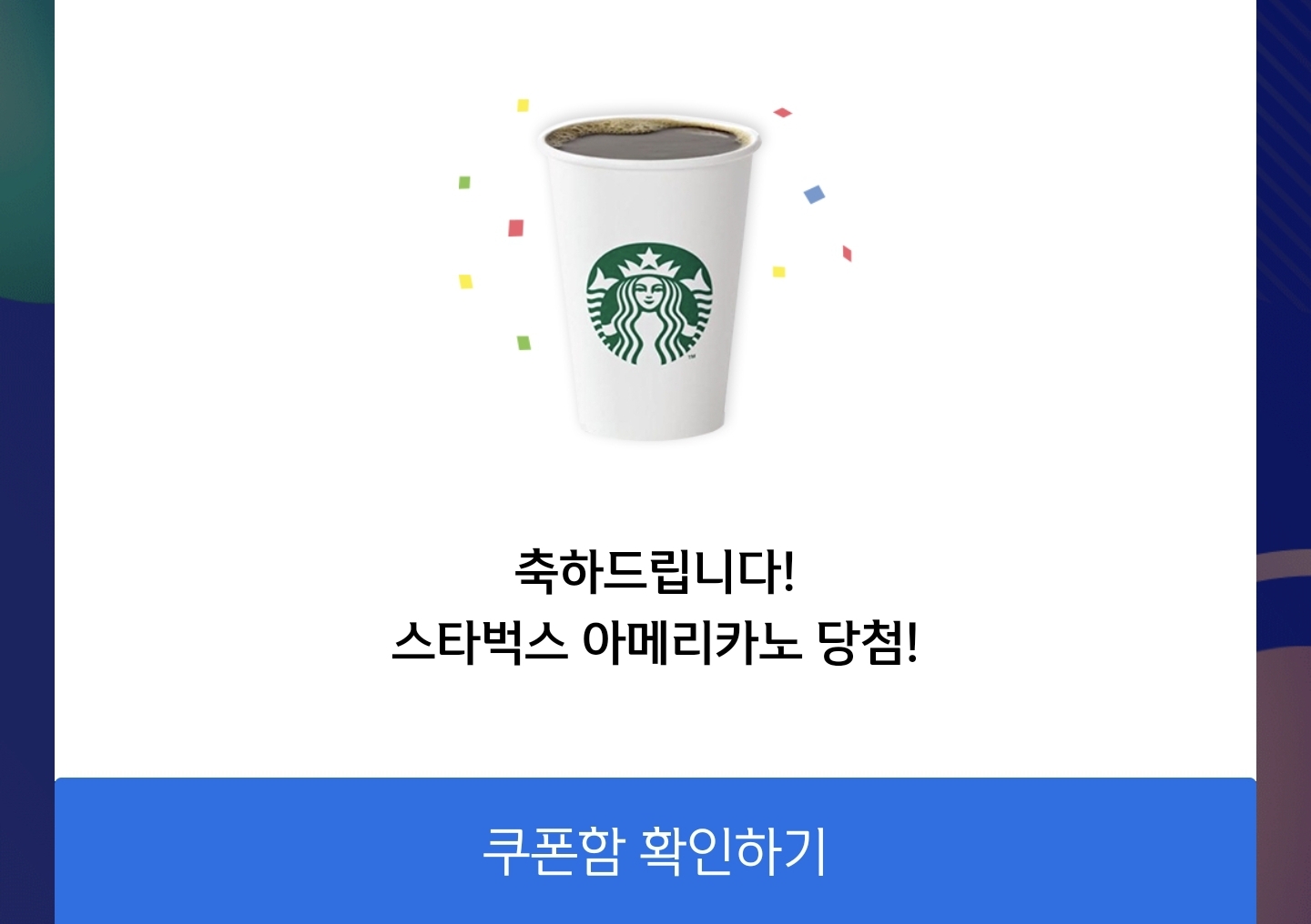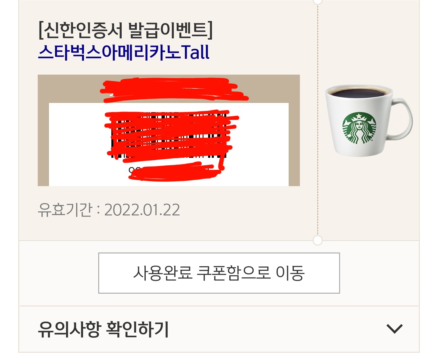 바로 스타벅스 아메리카노 톨사이즈 쿠폰을 받았습니다.