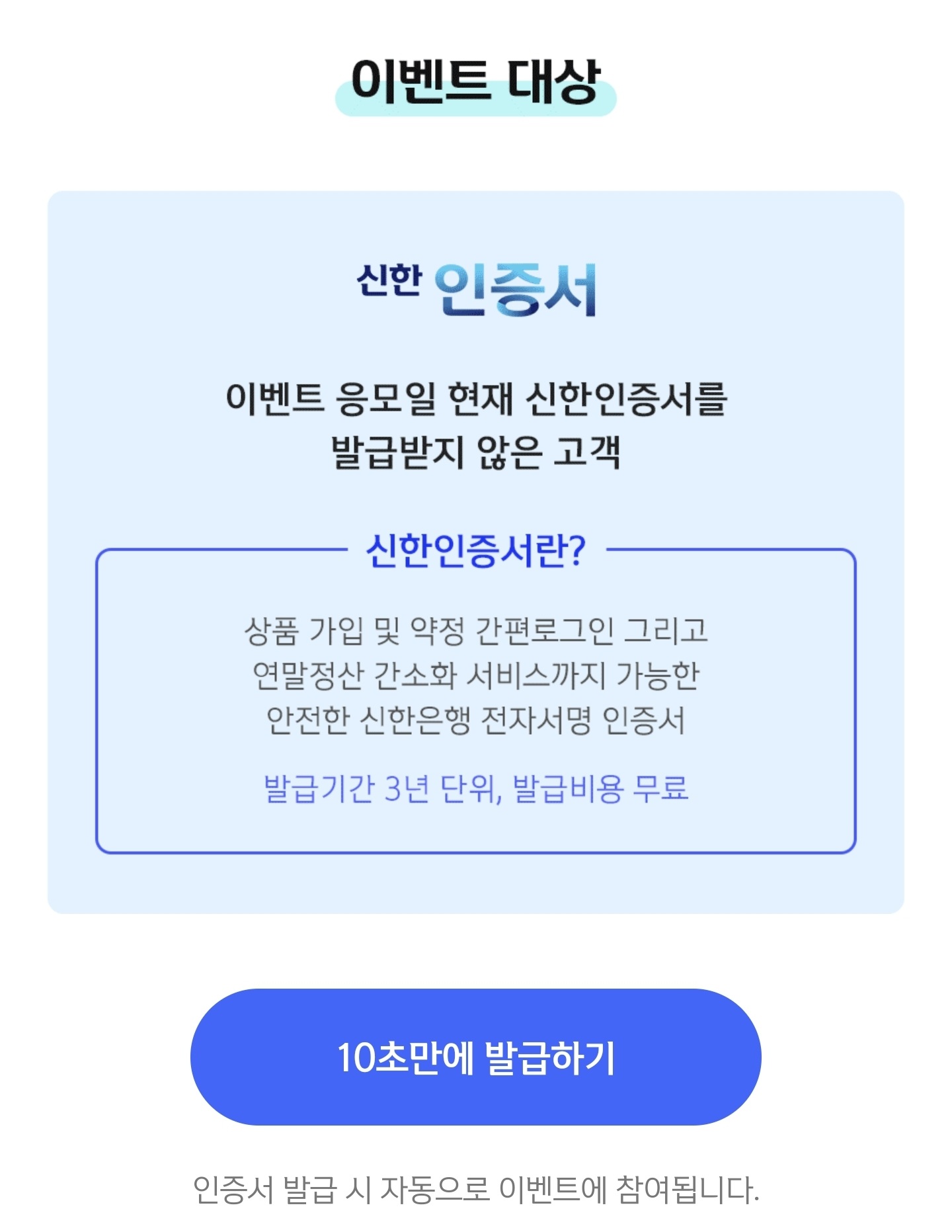 인증서 발급 이벤트 대상은 "인증서를 발급 받지 않은 사람" 입니다. 다른 금융권 이벤트처럼 계좌를 갖고 있는 사람이나 계좌 완전 신규 대상이 아니어서 참여 난이도가 굉장히 쉽습니다. 인증서 발급 시 자동으로 이벤트에 참여됩니다.