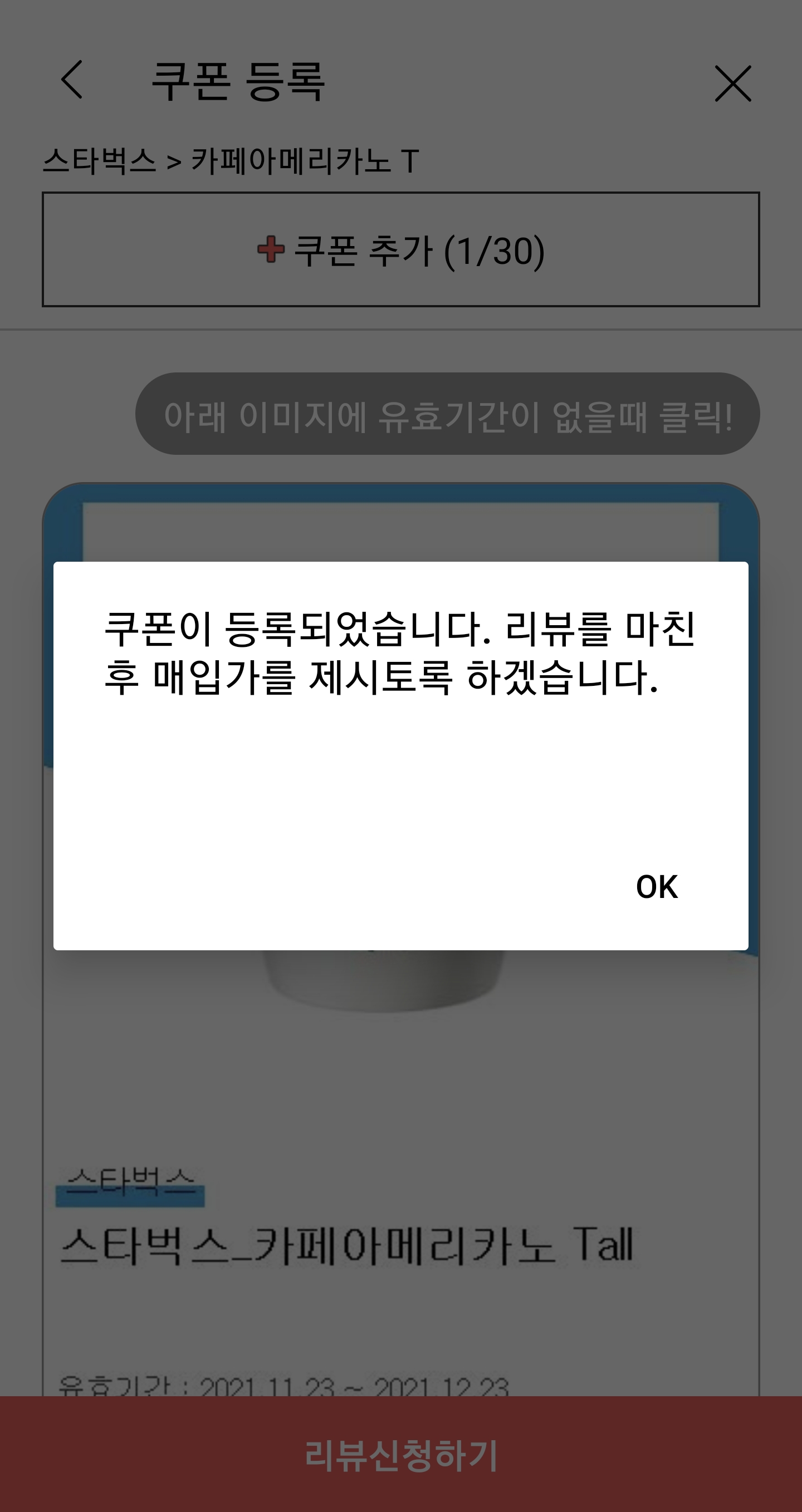상품을 선택하면 상단의 이미지와 같이 쿠폰추가 라는 버튼이 나오고 쿠폰등록시 유의사항, 검수를 빠르게 받고 싶다면 이라는 문구화면이 나옵니다. 불이익을 받지 않기 위해서는 한번은 훑어서 읽어보는 것이 좋습니다. 쿠폰추가 버튼을 클릭한다음에 쿠폰 이미지를 선택합니다. 그러고 나면 [쿠폰이 등록되었습니다. 리뷰를 마친 후 매입가를 제시토록 하겠습니다.] 라는 얼럿창과 함께 버튼이 나옵니다. 그러면 쿠폰이 등록된 것이고, 운영진에서 리뷰를 실행하고 나면 판매가가 등록되면서 푸시알림이 오게 됩니다.