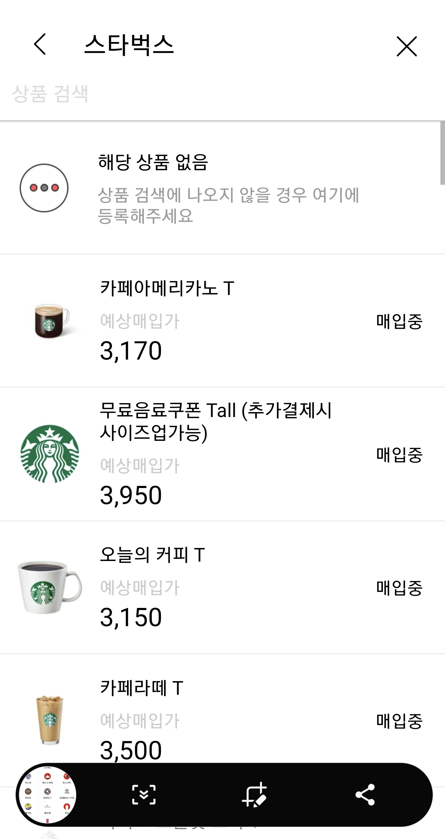 내가 판매하려는 기프티콘을 찾기 위해서 카테고리-> 회사명-> 상품명의 순서대로 선택하여 찾아 들어갑니다. 목록에서 상품을 찾을수 없으면 최상단의 [해당상품 없음]을 클릭하면 됩니다. 저는 이벤트 리워드로 수령한 카페아메리카노 T상품을 판매하였습니다.