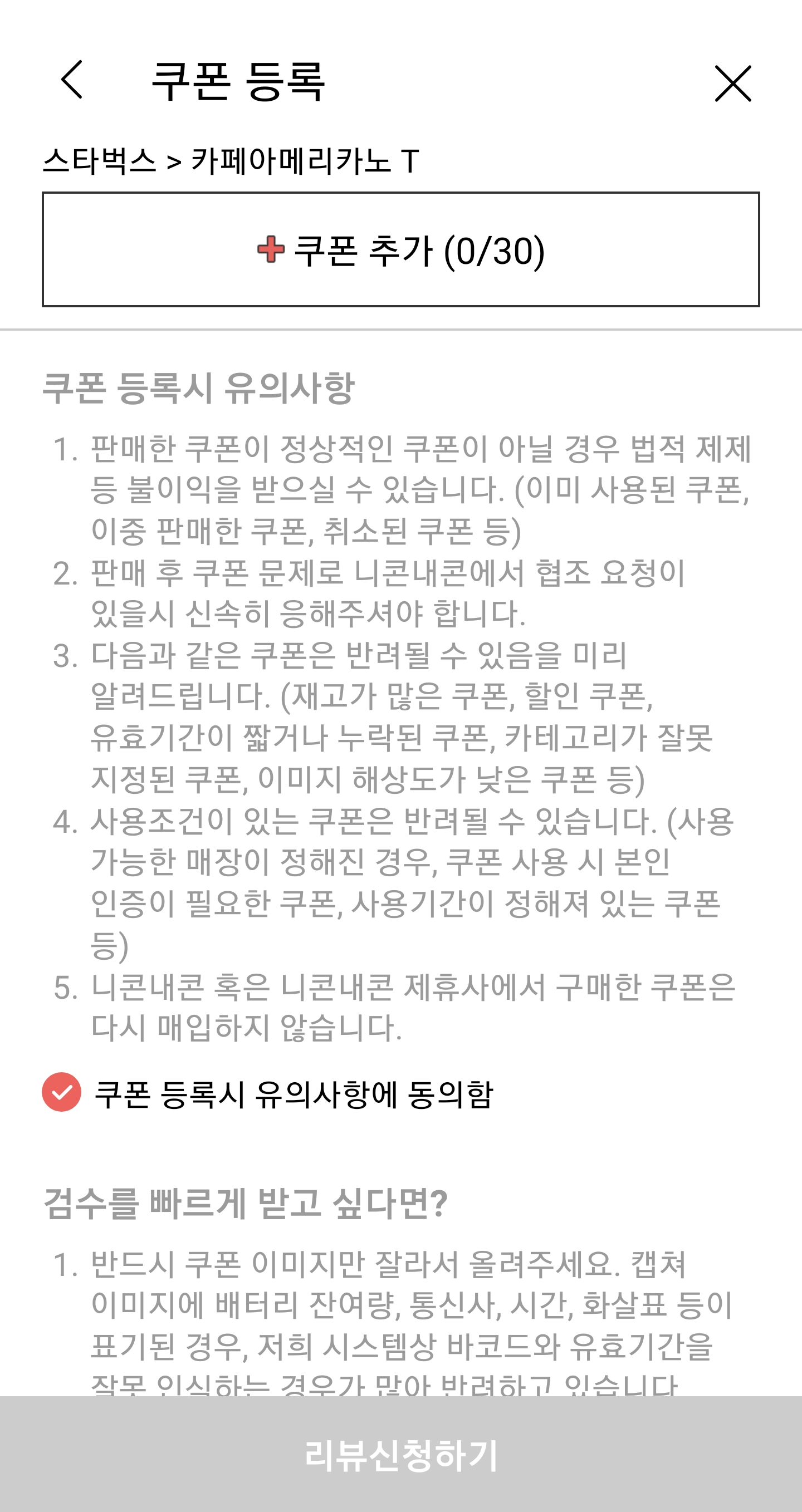니콘내콘에서는 기프티콘 판매를 하기 위해서 기프티콘 이미지를 업로드 하고 그 기프티콘 이미지를 운영진이 확인하고 판매 가격을 확정하는 행위를 리뷰라고 합니다. 그래서 리뷰라는 메뉴가 있고 기프티콘 이미지를 업로드하여 판매가를 정해주세요~ 하고 리뷰 등록을 하는 것입니다.