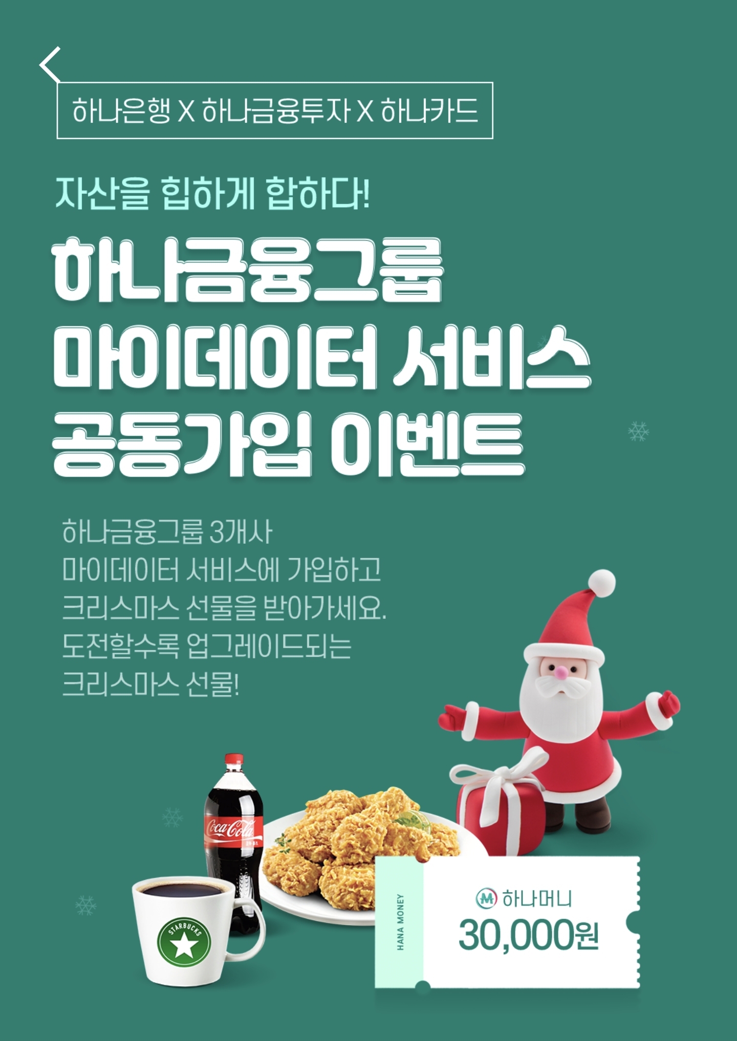 * 최근 마이데이터 서비스가 시행됨에 따라서 금융사 별로 꽤 달달한 혜택을 담은 이벤트를 많이 열고 있다. 그중에서도 가장 달달한 혜택을 제공하는 하나금융그룹의 마이데이터서비스를 소개하고 가입 과정에 대해서 소개해보겠음. 하나금융그룹 마이데이터 서비스는 하나금융투자, 하나카드, 하나은행 3개 동시에 가입했을 경우 하나금융그룹의 하나머니 30,000 포인트를 준다.