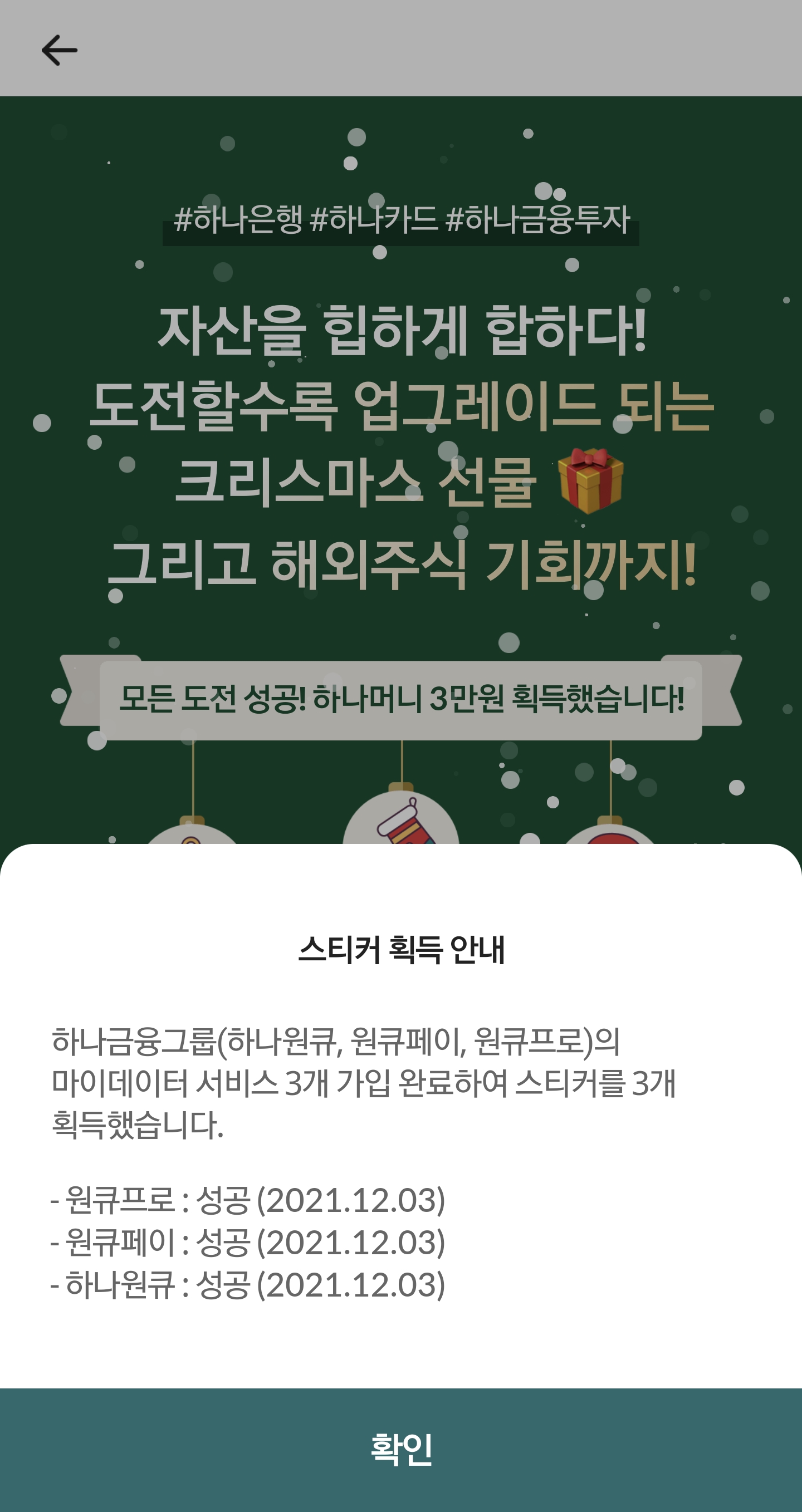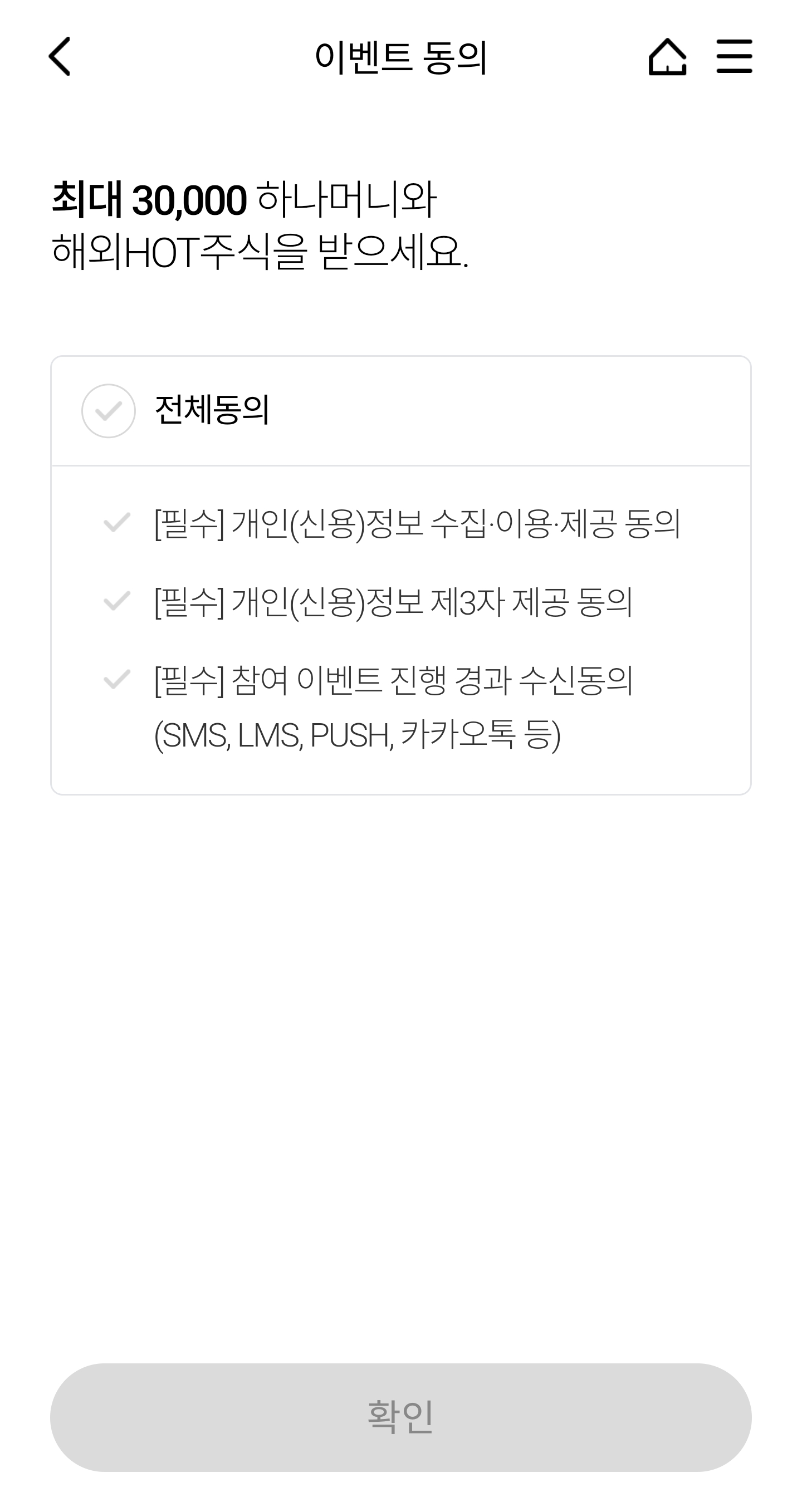 메뉴 찾기가 하나금융투자가 수월하기 때문이다. 하나금융투자에서 시작해서 하나은행으로 끝내면서 3개 회사의 마이데이터 서비스를 공동 가입하고 최종적으로 하나머니 30,000원 (현금화 가능) 을 받게 되는 것을 확인해야 한다. 나 같은 경우에는 하나은행 마이데이터 서비스 가입 후 이벤트 응모 완료 화면이 뜨지 않아서 재진행을 하여 화면이 뜰때까지 진행하였다. ㅜㅜ