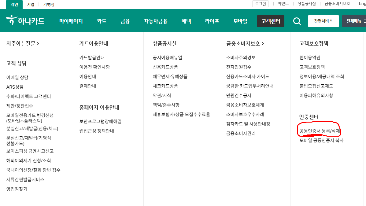 PC하나카드 홈페이지에서