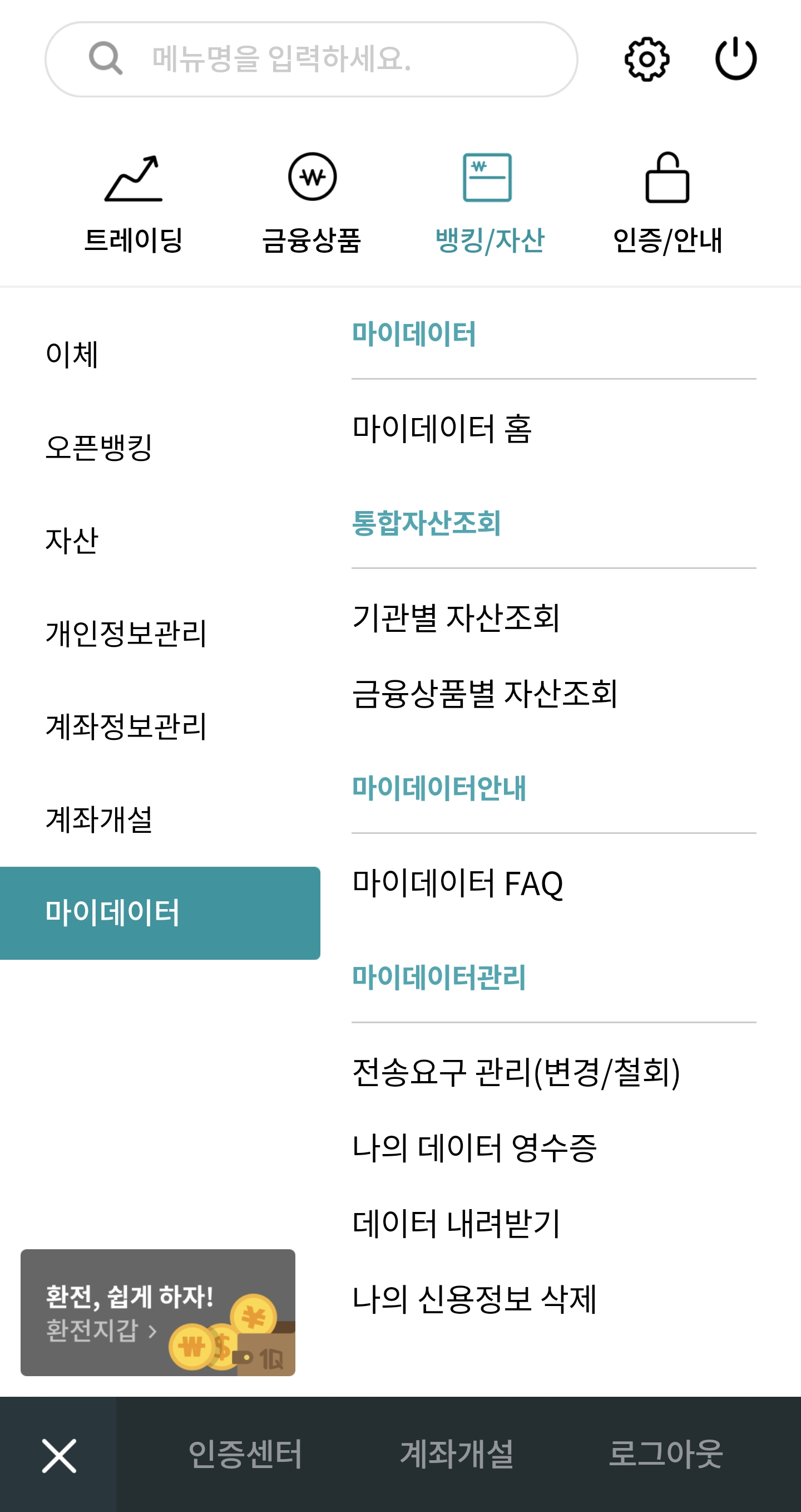 메뉴에서 뱅킹/자산 -> 마이데이터 -> 마이데이터 홈으로 차례대로 들어간다. (중요- 찾기 어려움)