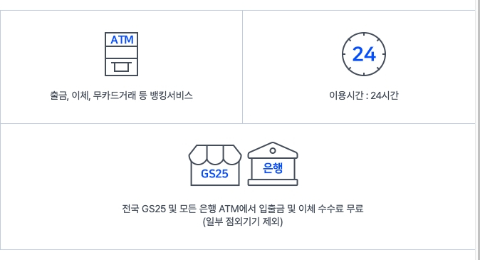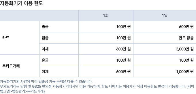 GS25와 모든 은행의 ATM(현금입출금기)에서는 입/출금, 이체, 무카드거래를 수수료 면제(무료)로 이용할 수 있습니다.