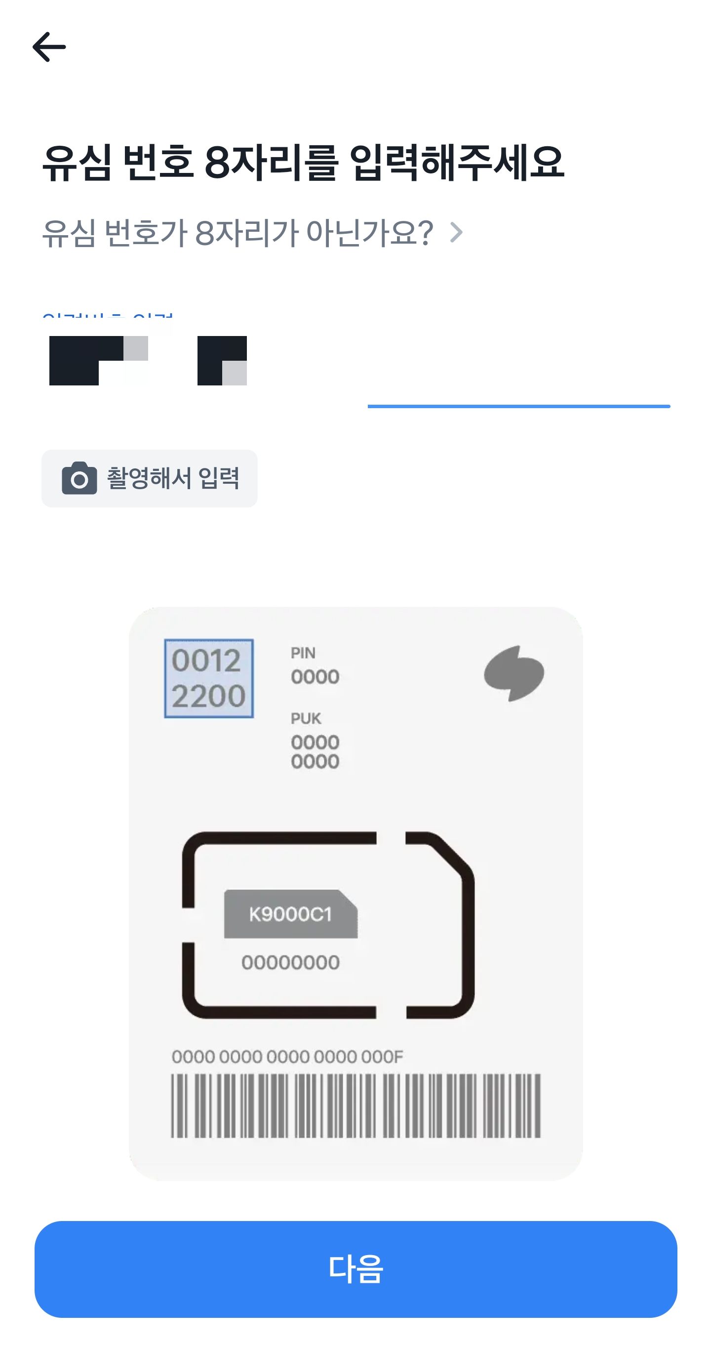 위와 같은 화면으로 유심칩의 일련번호를 입력한다.